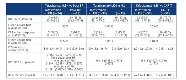 该研究中,将Monjuvi+来那度胺方案与最常用的r/r DLBCL治疗方案进行了对比,包括:Polivy(polatuzumab vedotin)+苯达莫司汀+利妥昔单抗(Pola-BR)方案、利妥昔单抗+来那度胺(R2)方案、CD19 CAR-T细胞疗法,共计3454例患者。